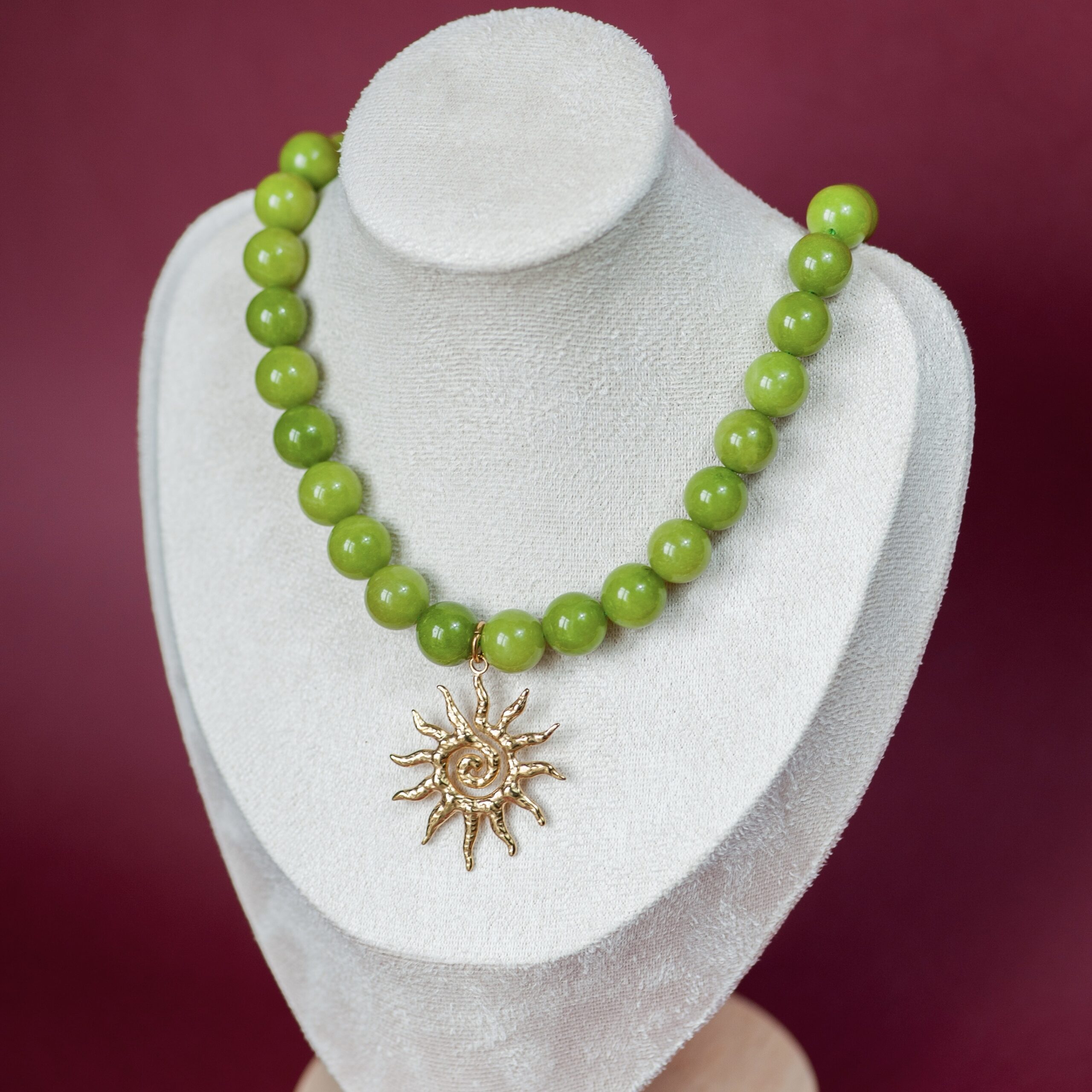 Collier en perles, réglable avec breloque soleil en acier inoxydable.